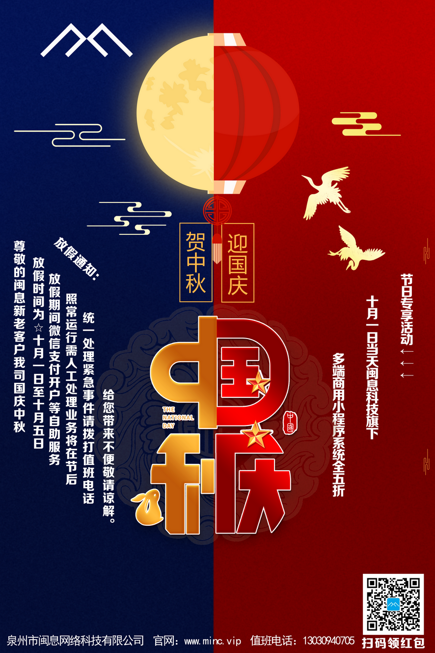 10月1日当天闽息科技旗下多端商用小程序系统产品全部五折。
